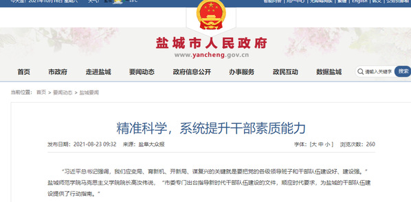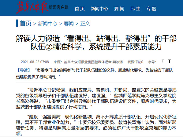 “市委专门出台指导新时代干部队伍建设的文件,顺应时代要求,为盐城的干部队伍建设提供了行动指南。”