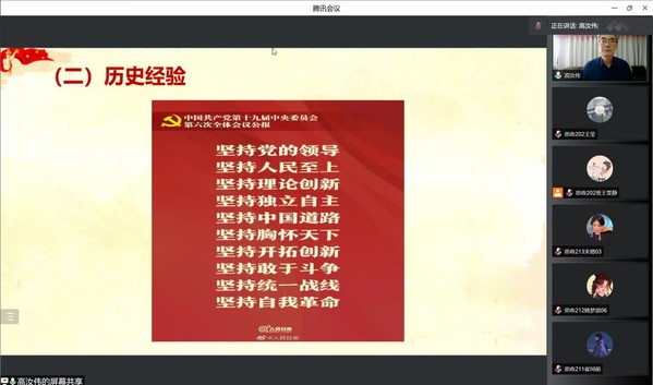 高汝伟以两个党史故事为切口,强调了总结历史经验的重要性,他围绕时代背景、坚持唯物史观和正确党史观、一个主题与四个时期、理论新飞跃与“两个确立”、历史意义和历史经验五个方面重点解读了十九届六中全会审议通过的《中共中央关于党的百年奋斗重大成就和历史经验的决议》。党课过程中,高汝伟与入党积极分子进行了亲切的交流,激励同学们要在学习十九届六中全会精神中感悟党的百年奋斗历史经验,续写时代辉煌。