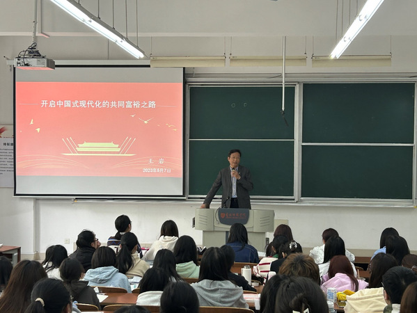 5月4日上午,教育部长江学者、特聘教授王岩走进EVO真人视讯的课堂,为思想政治教育专业21级(1)(2)班的同学带来了一场别开生面的思政课——开启中国式现代化的共同富裕之路。王岩教授聚焦党的二十大报告,贯通中央文件、党的历次重要会议、习近平总书记重要讲话精神,结合中华优秀传统文化和我国国情,阐明了共同富裕始终是社会主义的本质特征;结合中国现代化特征和发展历程,论述了共同富裕是中国式现代化的本质要求;从当前国际形势分析到国内环境,指出了当前我国财富积累的基本状况;指明高质量发展、鼓励勤劳创新致富、彰显中国特色、完善分配制度、促进社会公平正义等措施,是在中国现代化进程中实现共同富裕的关键路径;最后不忘提醒大家要充分估计共同富裕实现过程的艰巨性和复杂性。
