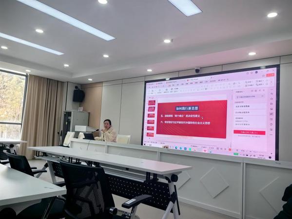 主讲教师陈爱娟对课程的主要内容、重点难点进行了提纲挈领地概括,向教研室老师系统从时代背景、“两个结合”角度回答了“新思想”实现新飞跃的必然性,并系统阐述了“新思想”的科学体系、历史地位以及如何践行新思想等基本内容。将内涵丰富的理论生动活泼地展现在老师面前,令与会教师耳目一新。