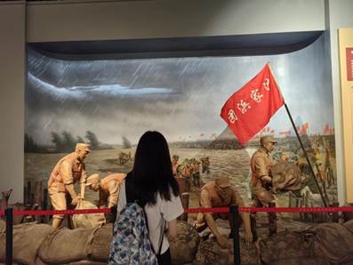 抵达纪念馆,首先映入眼帘的是那面庄严的五星红旗,团队成员们整齐列队,面向国旗,庄严宣誓。随后,成员们参观了“抗日战争”、”解放战争”、”新中国成立后”及”新时代”展区。通过讲解员的讲述,他们深入学习了沙家浜地区军民在党的领导下,开展游击战,保卫家园的故事。“此次社会实践活动的开展,旨在通过参观学习与实地调研,帮助同学们感受红色文化的魅力,增强同学们对红色文化的认同感。作为一名思政课教师,我也将不断追寻红色足迹,丰富课堂内容,创新教学模式。”实践团指导老师邱天星说道。