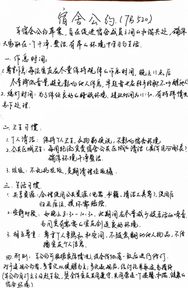 各个宿舍的同学从生活作息、卫生习惯、安全问题等方面商讨和建立宿舍公约,并制定奖惩措施。通过以宿舍为单位的公约分享,各宿舍再次进行补充和完善,为促进宿舍成员相互尊重、理解和包容准备条件。