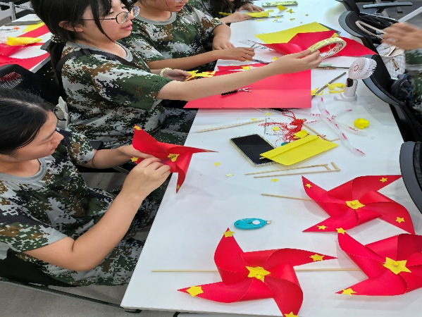 活动现场,同学们以小组为单位,动手制作风车、团扇和手环等手工艺品。同学们巧妙地利用纸张和木棍,通过折叠、粘贴等步骤,红色风车逐渐成形。四星点缀风车,围绕着中心五角星旋转,寓意全国人民团结一心,共迎国庆。