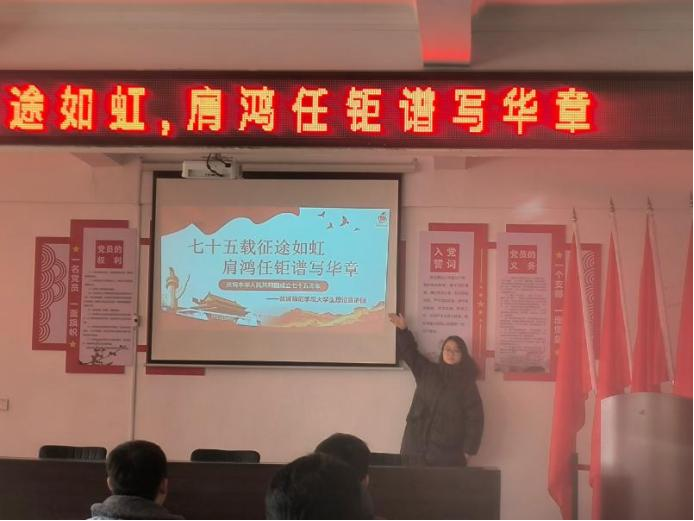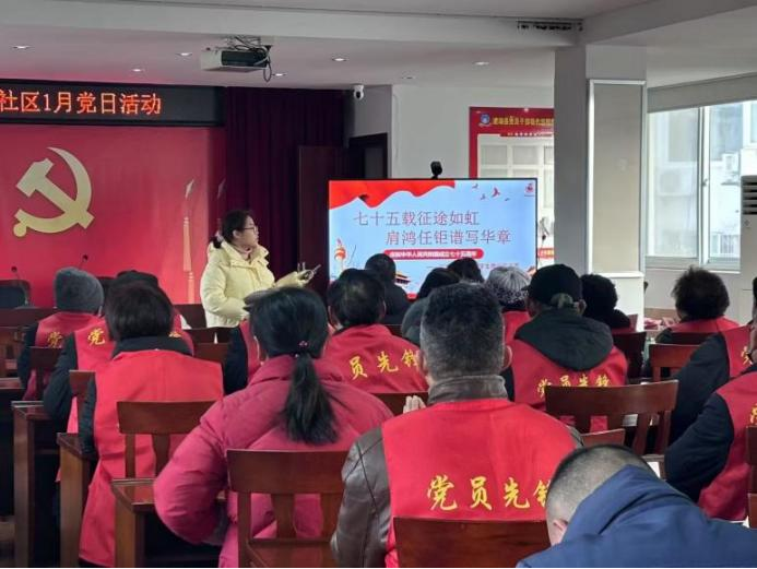 宣讲员以“七十五载征途如虹,肩鸿任钜谱华章”为主题,带领社区党员重温新中国发展历程,以传承续历史,用奋进促发展。宣讲围绕新中国成立七十五年的历史进程、各领域成就以及对社会成员的启示等方面展开,凝聚青年共识,助力国家发展。
