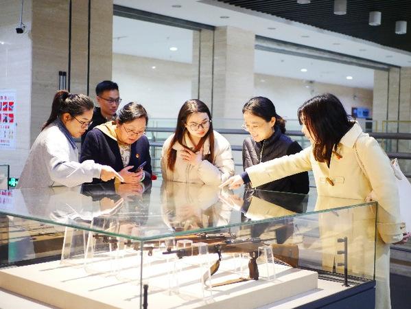 员工党员金炜程在5D影院观看“一只碗”的革命故事后动情地说:“革命先辈彼此相赠的一个小小的白瓷碗,如今传承到我们新一代青年手中,正是中华民族同甘共苦的精神图腾的体现。”在木艺体验区,师生们精心雕刻的“团结徽章”上,新四军臂章与民族团结的花纹交相辉映。