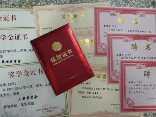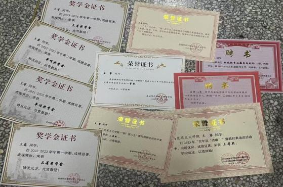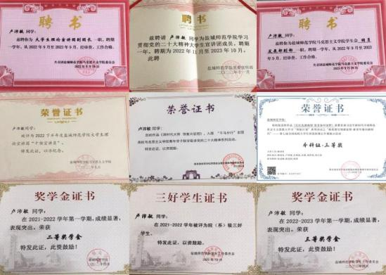 曾获盐城市“黄海明珠”老员工奖学金、校级三好员工、优秀共青团干部、优秀共青团员、暑期“三下乡”社会实践先进个人等荣誉,多次获得校级一等奖学金、二等奖学金、三等奖学金。