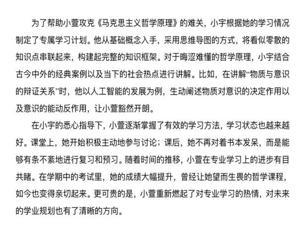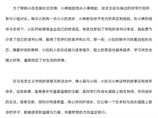 这些饱含真情与智慧的作品,生动展现了朋辈互助的力量。无论是学习困境中的携手突破,还是心灵迷茫时的温暖相伴,都成为校园里动人的成长印记,也为更多同学应对学业与生活挑战提供了可借鉴的鲜活范本。