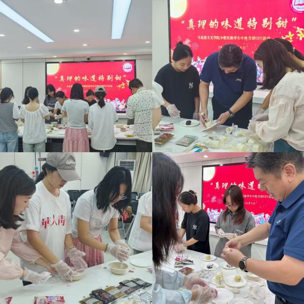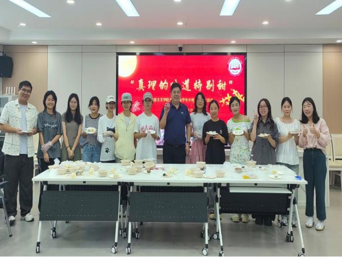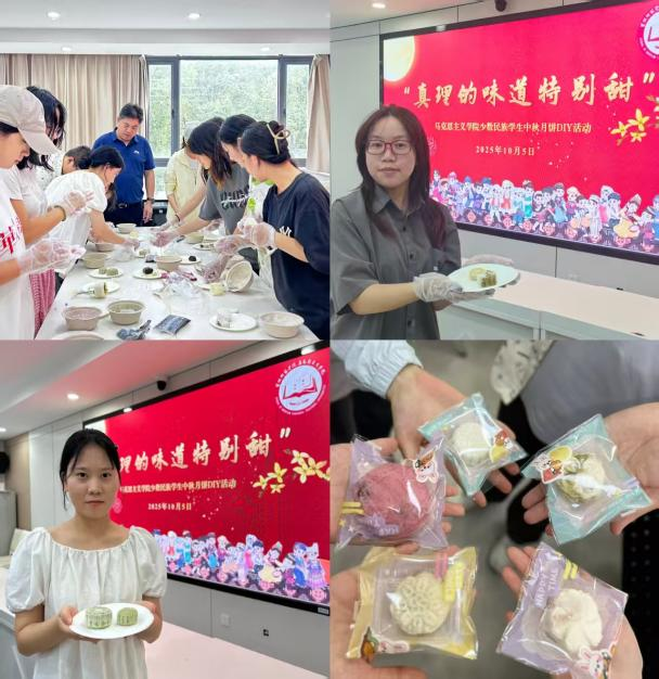 在老师的耐心示范和指导下,同学们认真学习揉制饼皮、包裹馅料、压膜成型等步骤。不一会儿,空气中便弥漫起月饼的香甜气息。一个个带着手心温度的月饼,不仅裹着面团的软糯,更承载着马院学子们对家乡的深切思念和对校园生活的真挚热爱。